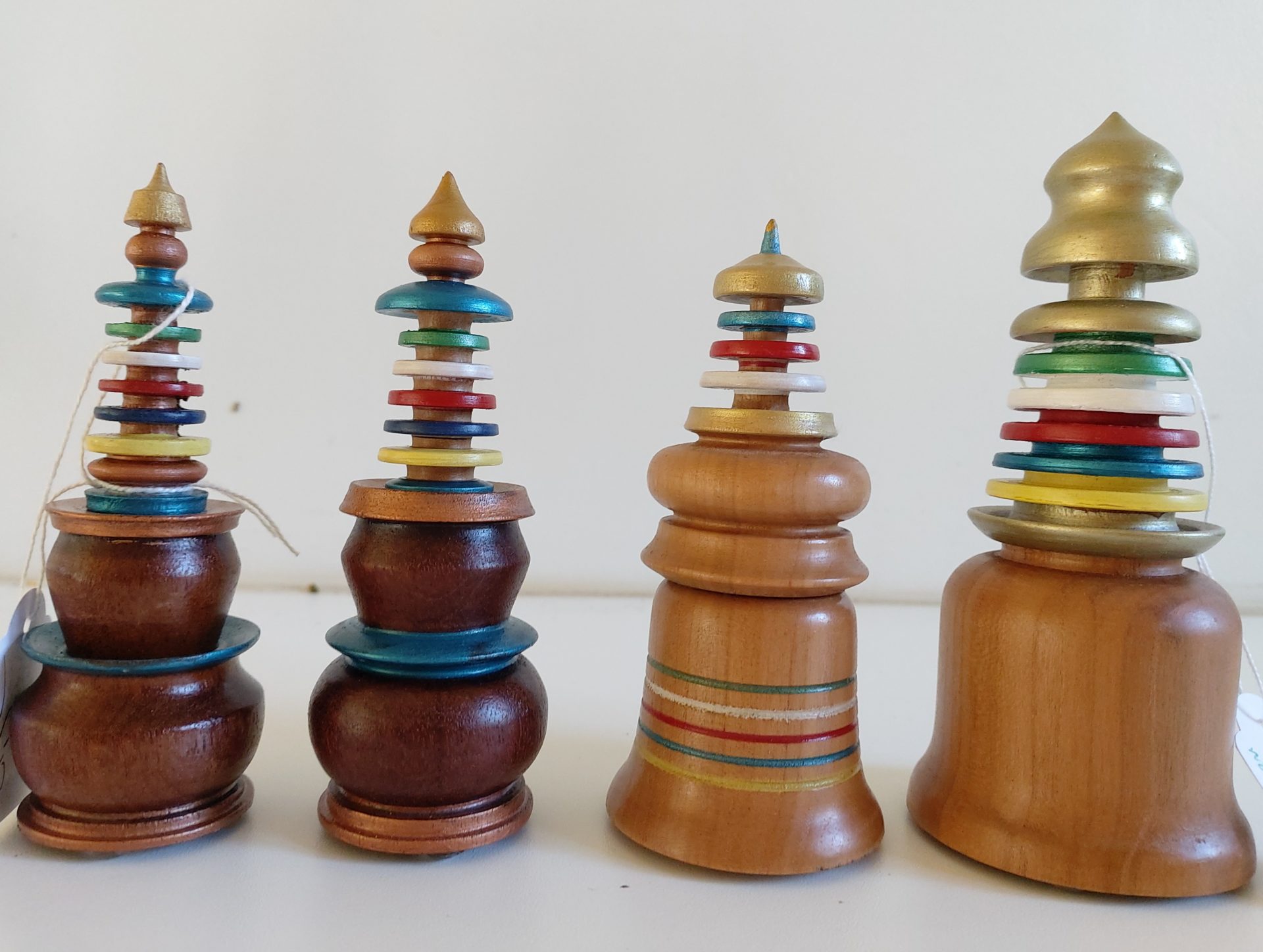 Les Chörten (Stupa en Tibétain) sont la représentation symbolique de la Sagesse du temps de par les 5 éléments et les 3 Joyaux. Les Chörten créés par Gué Kartchène Eusèr sont tous chargés énergetiquement, certains contiennent des protections puissantes et aussi des reliques de son éminence Kyabjé Dr. Trogawa Rinpoche. Ils sont faconnés au Tour à bois avec des essences rares (érable, noyer, pommier, acajou, amarante du Brésil, olivier, frêne, aulne, merisier, érable rouge…). Ils sont créés pour matérialiser et émaner en fonction de l’essence du bois choisi: l’Harmonie, la Paix et la Protection. Les petits Chörten sont réalisés avec une seule essence de bois, les moyens et grands modéles ont 2 essences, ils dispensent une émanation d’équilibre et d’ouverture. Il est possible de commander la fabrication d’un Chörten en lien énergétique avec sa date de naissance (cela demande un délai de 1 mois pour la fabrication). Plusieurs modéles sont en exposition et disponibles avec en annotation leurs essences et attributs.